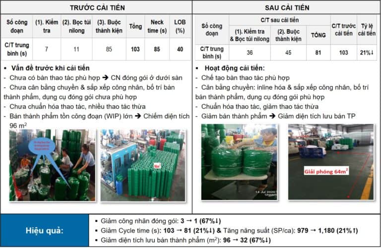 – Tăng năng suất đóng gói trong 1 ca từ 979 can lên 1.180 can. Tỷ lệ tăng là 21%.
