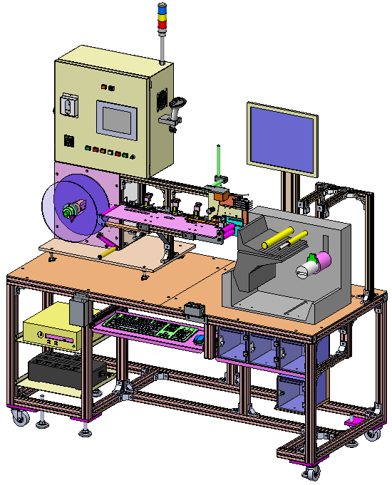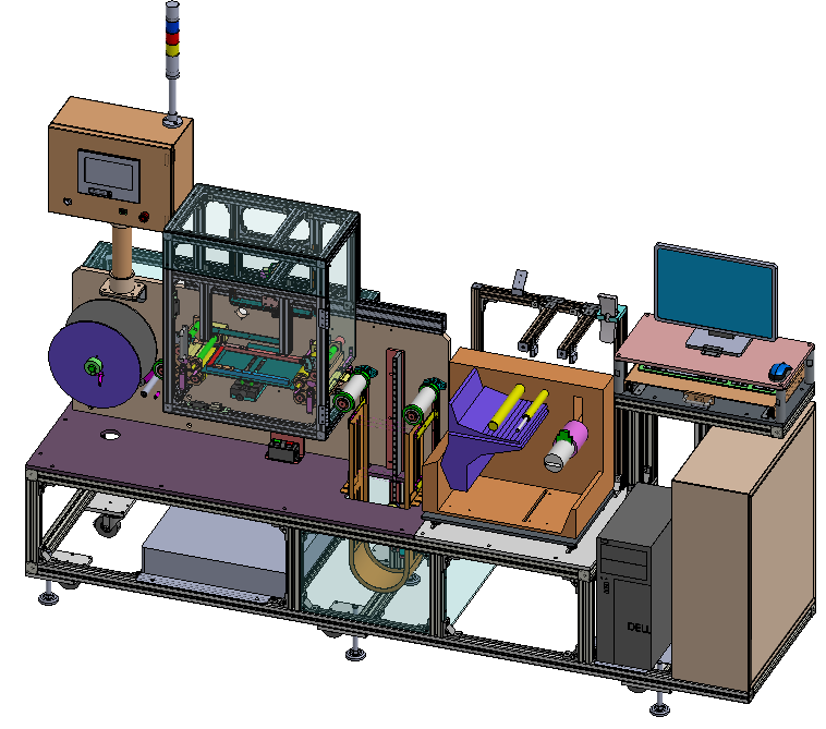 Máy in và kiểm tra nhãn được thiết kế với các cơ cấu tự động từ cấp giấy → in nhãn → kiểm tra → cuộn nhãn lại.