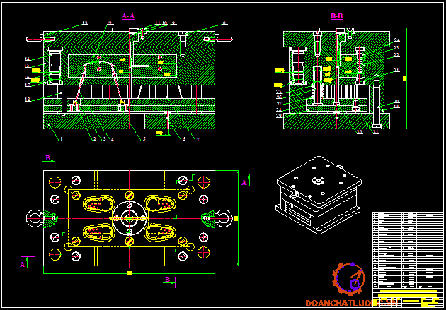 Giai đoạn 3: Triển khai thiết kế khuôn 2D, 3D và bản vẽ chi tiết khuôn. Lên danh sách linh kiện tiêu chuẩn.