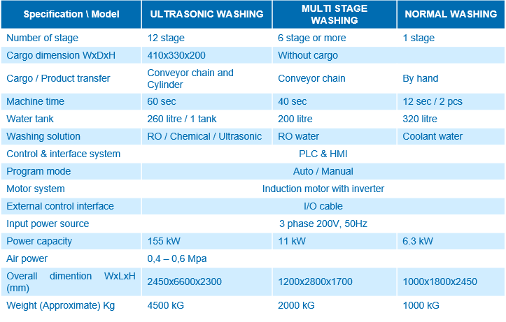 Tất cả các công đoạn rửa đều được kiểm soát về áp suất rửa, áp suất khí, tần số siêu âm, nhiệt độ sấy, áp suất chân không…Hệ thống nước được lọc và tái tuần hoàn sử dụng. Máy rửa sử dụng bơm áp lực cao để rửa các vị trí khó rửa và làm sạch bụi bẩn, phoi… sơ bộ trước khi đưa vào công đoạn rửa siêu âm.
